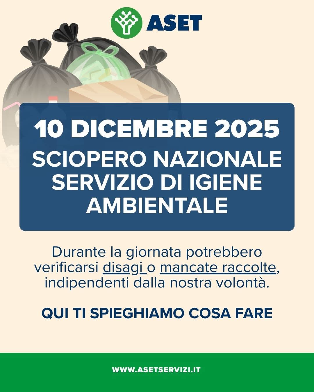 Si informa che per mercoledì 10 dicembre 2025 è stato proclamato uno sciopero nazionale unitario che potrà coinvolgere il servizio di Igiene Ambientale nei Comuni serviti da ASET: